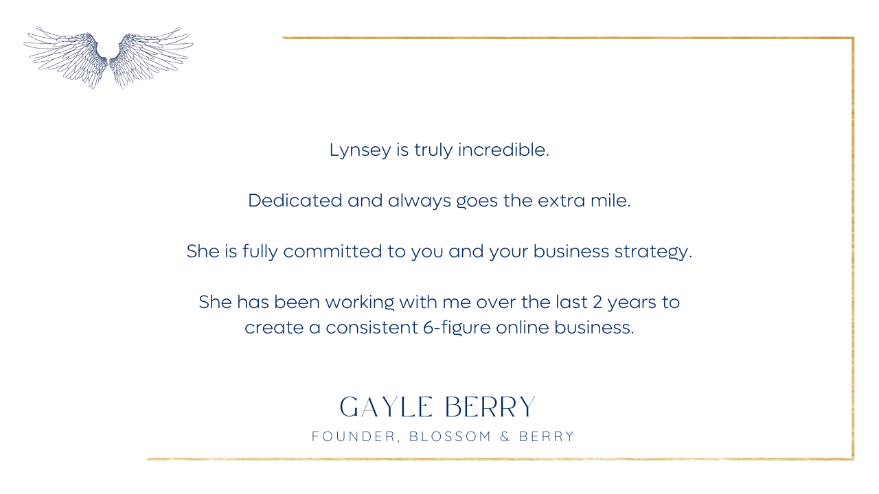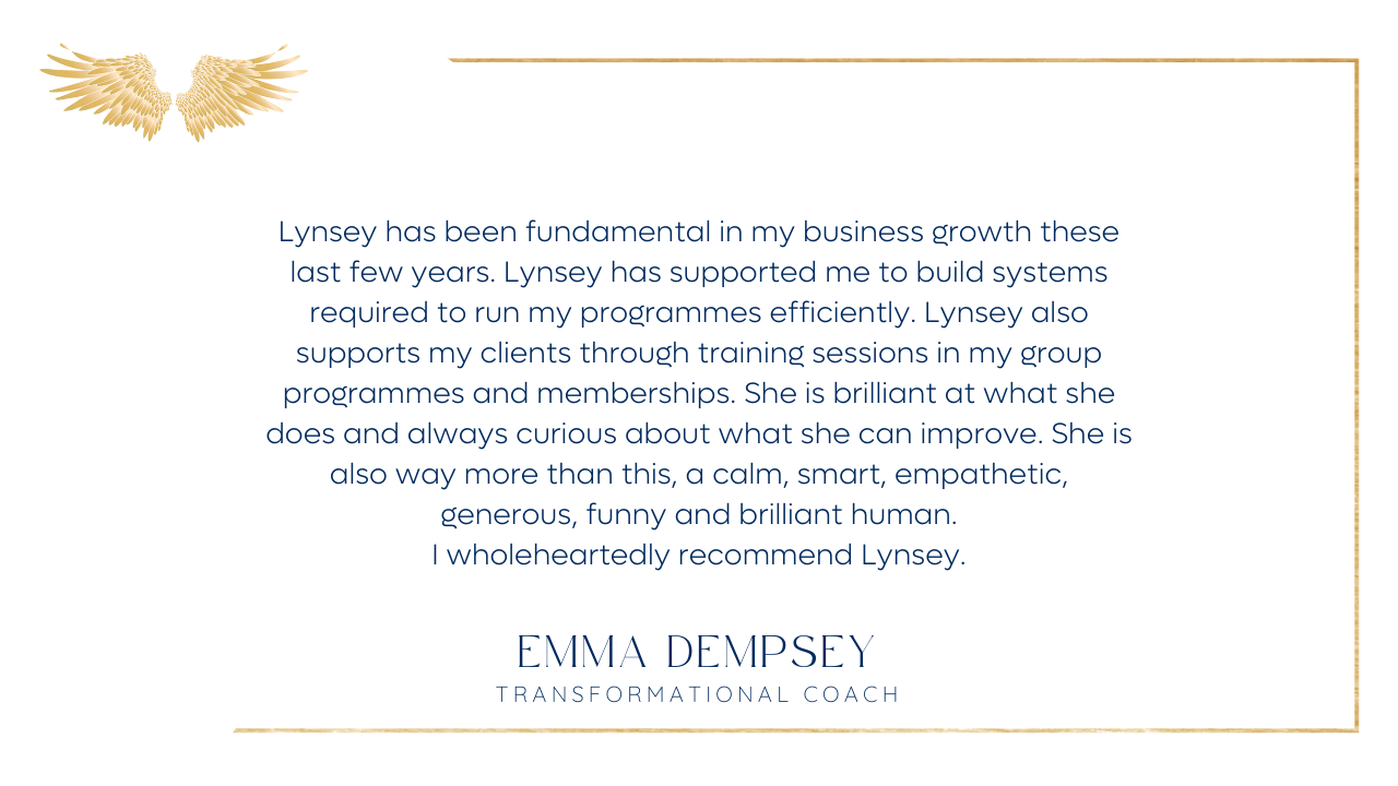 “I have been fortunate to have Lynsey by my side supporting me in my business for a year now. I had done many courses on creating online courses, but always reached a brick wall because the tech felt too difficult for me to manage. What is so unique and special about Lynsey is that she can advise, support and take care of the tech side of your business as well as supporting you emotionally to believe in yourself and your potential so that you can attain the visions that you hoped for. She is incredibly calm and consistent and has coped when I have had wobbles and consistently believed in my product and my potential which has kept me going. I now have a really successful programme which I will be launching again with her help again this autumn.”