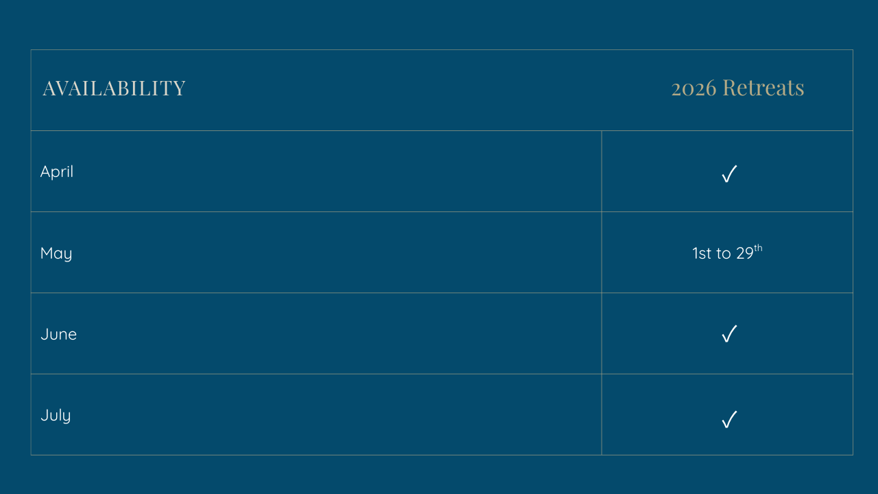 Not just a retreat: a reset. Just for you. Deeply personal. Fully held. No distractions. Just your energy, your vision and your (exciting) next chapter.